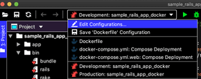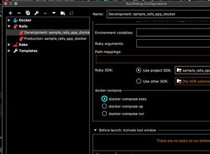 Rails -> Development: sample_rails_app_docker を選択肢、画面下部の “docker-compose” が “docker-compose exec” になっている事を確認します:
