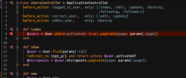 それでは試しに UserController#index にBreakpointを置いてみましょう: