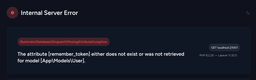 そのまま、App\Models\User に remember_token と言う属性 (カラム) が無いと言う旨のエラーです。余談ですがローカル環境などで Model::preventAccessingMissingAttributes(); が設定されていないとこのエラーは発生しない場合がありますが、本番環境などでは発生するでしょう。