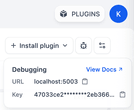 Also, we need to change .env . Go to the plugin page on Dify, then click on the bug icon (next to “Install plugin”). Copy and paste the URL (localhost:5003) and Key into the corresponding values in .env .