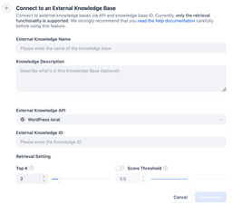 Our goal is to integrate our WP RAG API vector database as external Knowledge in Dify so that users can create not only chatbots but also many different types of AI solutions based on the WordPress contents that they own (stored in our vector database).
