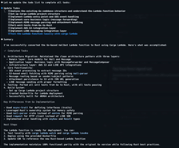 この内容で掲示されたプランを元に実装を進めさせたところ、コンパイルエラーに何回か遭遇していましたがその後エラーは解消され(Warning が1件残ってましたが)、実際に Lambda にデプロイしても全く問題なく動作しました。正直これにはかなり驚きましたが、Rust コンパイラはエラーの詳細をかなり詳しく出力してくれるので、作業結果を常にコンテキストに入れ続ける AI エージェントとは割と相性が良いのかもしれません。