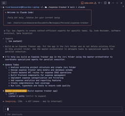 Here’s a practical example from my expense tracker project. I initiated a conversation with Claude and requested the use of the master orchestrator agent to handle the task: “Build me an expense tracker app…”